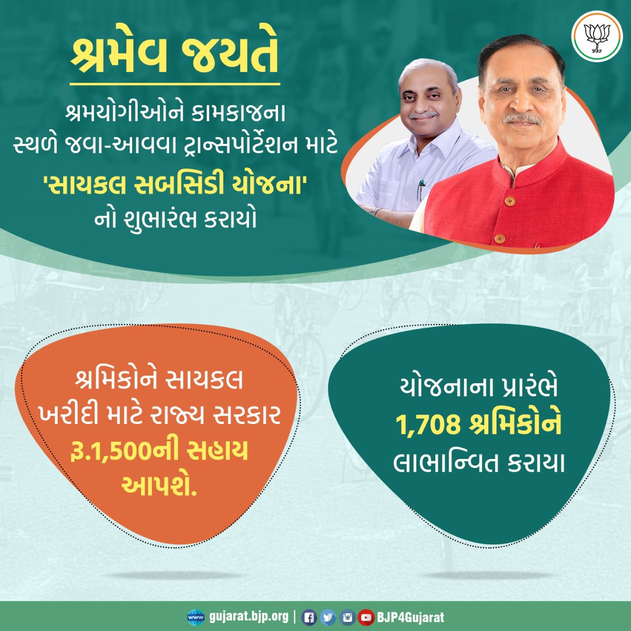 The state government has launched a 'Cycle Subsidy Scheme' for the transportation of laborers in the state. Apart from that, various assistance of Rs. 2 crore 32 lakh has also been given to a total of 9836 laborers and families of the state. Chief Minister Vijay Rupani launched e-Dedication of Labor Welfare Center buildings constructed at a total cost of Rs 4.59 crore in Ahmedabad and Vadodara as well as launched 3 mobile vans and mobile app for health check-up of workers with a grant of Rs 35 lakh from Indian Oil Corporation under CSR.